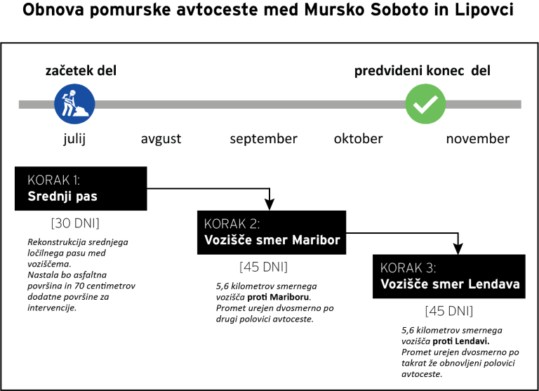 Gre za naslednjo fazo obnove pomurske avtoceste med Mursko Soboto in Turniščem, ki je stekla že v začetku julija in zajema obnovo več kot 11 kilometrov vozišča in objektov na obeh polovicah avtoceste. Dela so sicer vredna 12,59 milijona evrov, izvajalca pa sta družbi Pomgrad in VOC Celje.