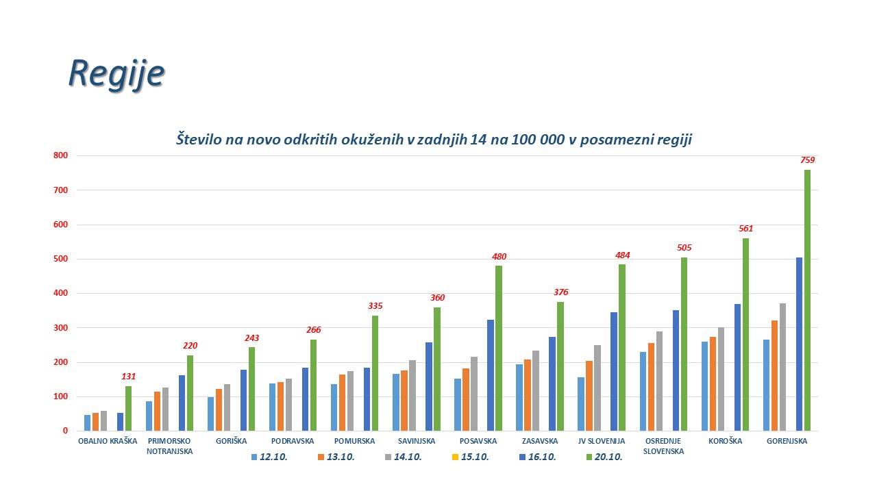 Današnja incidenca je sicer toliko slabša, beležimo 547,45 okuženih na 100.000 prebivalcev v zadnjih 14-dneh. »Pri nas se virus širi praktično povsod. Močno pa izstopajo Domžale (včeraj 89 okuženih), Škofja Loka (56), Velenje (59), Žalec (34), Gorenja vas Poljane (26). Med večjimi kraji pa Kranj (68), Jesenice (41), Novo mesto (31), Ptuj (23), Murska Sobota (21), Koper je že skočil na 38, « je pojasnil Kacin.