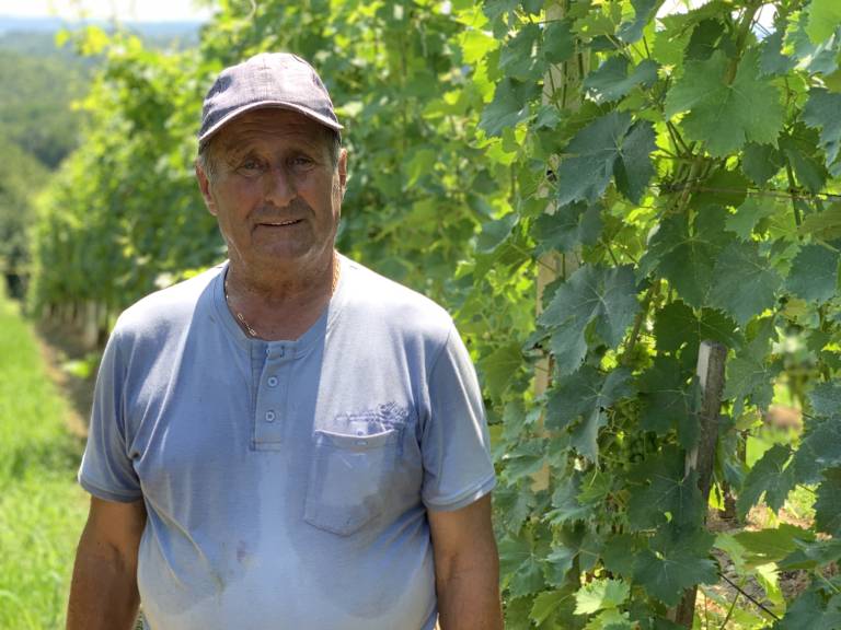 Stanko Holc, ki v Senčaku pri Juršincih obdeluje skoraj 7000 trsov vinograda, je zadovoljen s pogledom na letošnje grozdje. »Je kar zdravo grozdje, niti peronospore ni na vrhih, kjer je navadno bila,« nam v svojem vinogradu pove Holc.