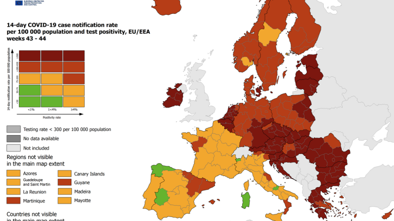 S temno rdečo barvo so na zemljevidu Evropskega centra za obvladovanje in preprečevanje bolezni označena območja, kjer 14-dnevna incidenca okužb z novim koronavirusom na 100.000 prebivalcev presega 500, pri izračunih pa sicer upoštevajo tudi delež pozitivnih testov.