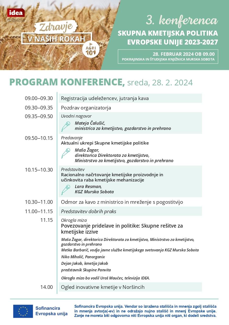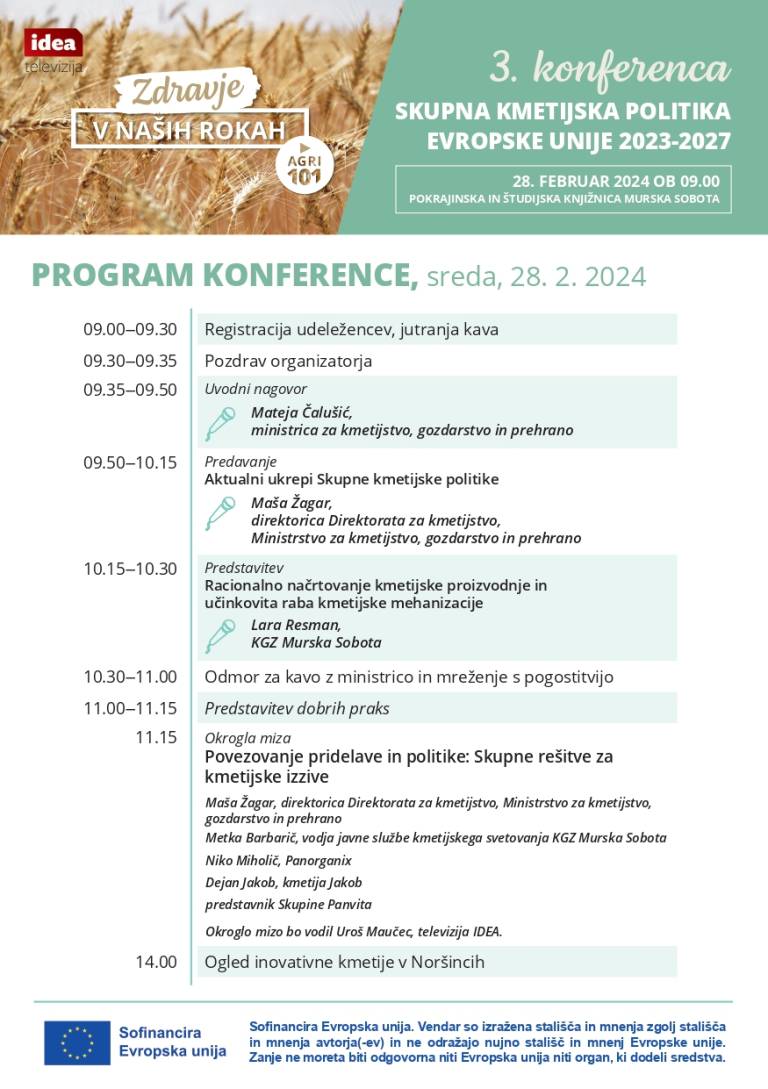 Televizija IDEA sklopu projekta Zdravje v naših rokah pripravlja že tretjo konferenco, na kateri se bodo osredotočili na predstavitev aktualnih prilagoditev in ukrepov Skupne kmetijske politike, s katerimi Evropska unija poskuša omiliti pritiske, s katerimi se spopadajo evropski kmetje.