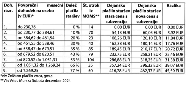 S spremembo bi se za povprečnega starša cena na mesec s subvencijo povišala za 24,16 evra mesečno.