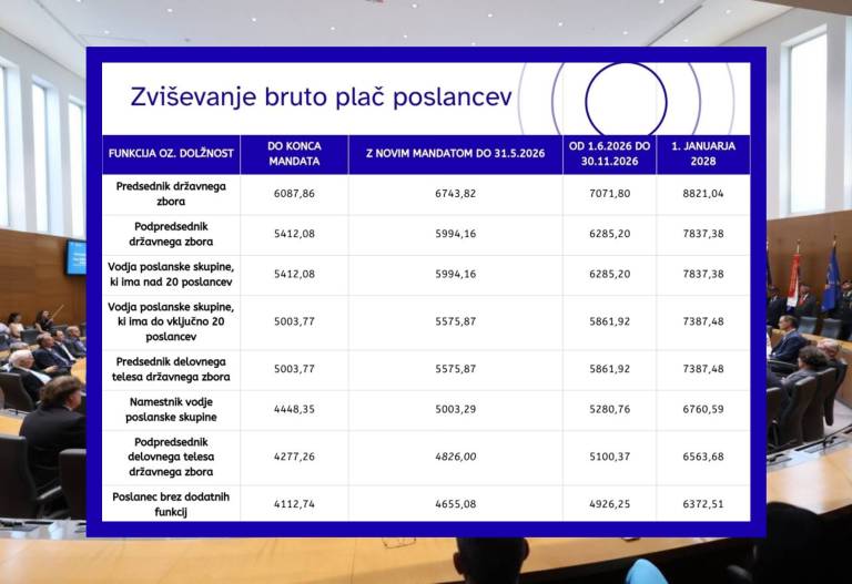 Poslanci z dodatnimi funkcijami bodo prejemali še višje zneske – že v novem mandatu okoli 5994 evrov, do leta 2028 pa lahko več kot 7800 evrov bruto.