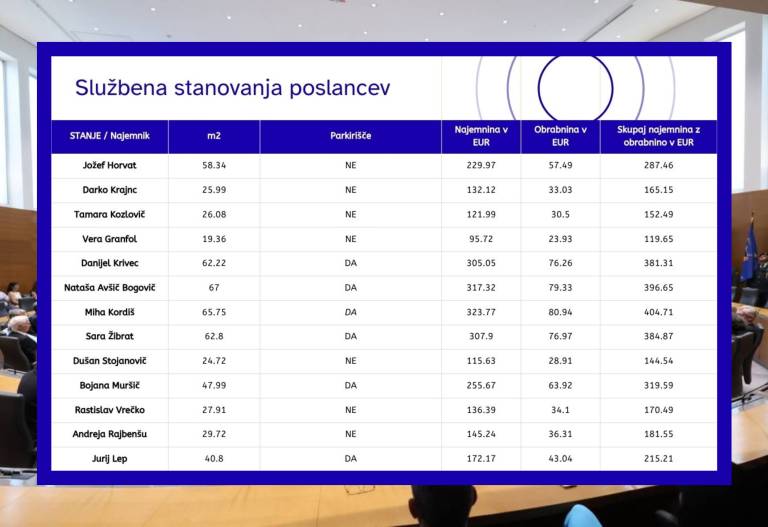 Za primer: poslanka Nataša Avšič Bogovič za 67 kvadratnih metrov veliko stanovanje plačuje 317,32 evra najemnine in 79,33 evra obrabnine, skupaj 369,65 evra mesečno. Miha Kordiš, ki ni bil ponovno izvoljen, pa je za približno 65 kvadratnih metrov veliko stanovanje plačeval dobrih 404 evre mesečno.