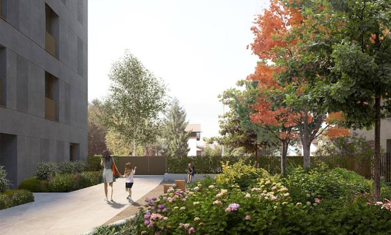 Skupne zelene površine bodo bogato zasajene in oblikovane tako, da bodo zagotavljale visoko raven zasebnosti in hkrati spodbujale povezanost med stanovalci.