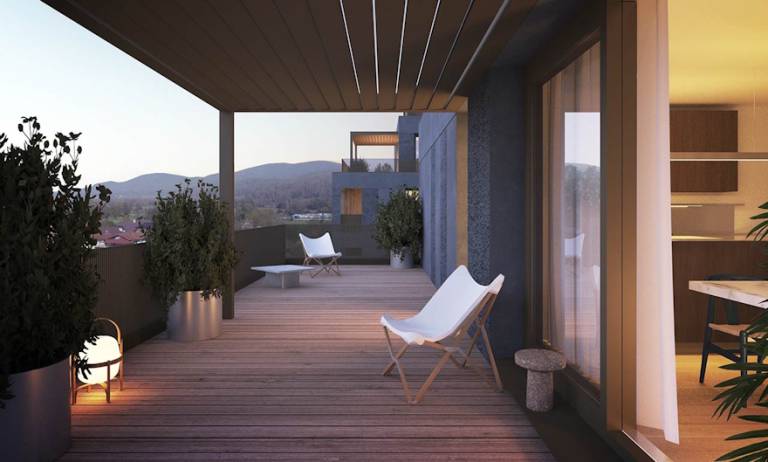 Pritlična stanovanja imajo priključke za letno kuhinjo in lastne pergole, medtem ko so najprestižnejša stanovanja v terasnih etažah opremljena z zasebnimi vhodi iz dvigala.