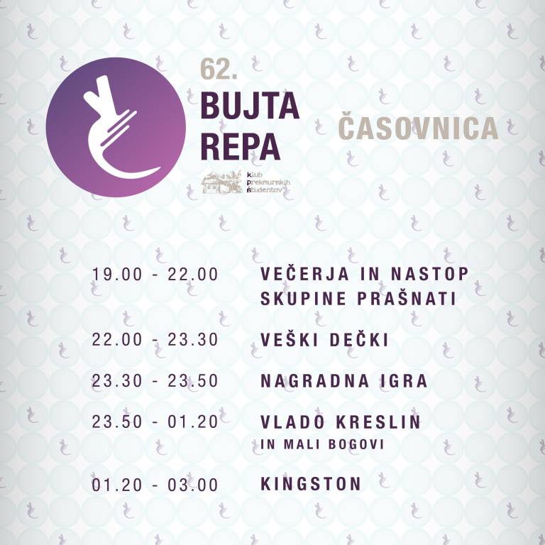 Večerjo bo ob zvokih cimbal, saksofona, harmonike, bobnov in kontrabasa popestrila skupina Prašnati. Po večerji, ob 22. uri, bodo za nadaljevanje večera poskrbeli Veški dečki, ki bodo množico zabavali vse do 23.30. Po dobrem začetku zabave bo na odru vse do 1.20 zjutraj publiko razvajal Vlado Kreslin z Malimi bogovi. Za konec letošnje Bujte repe pa bo z obiskovalci vse do zgodnjih ur norela skupina Kingston.