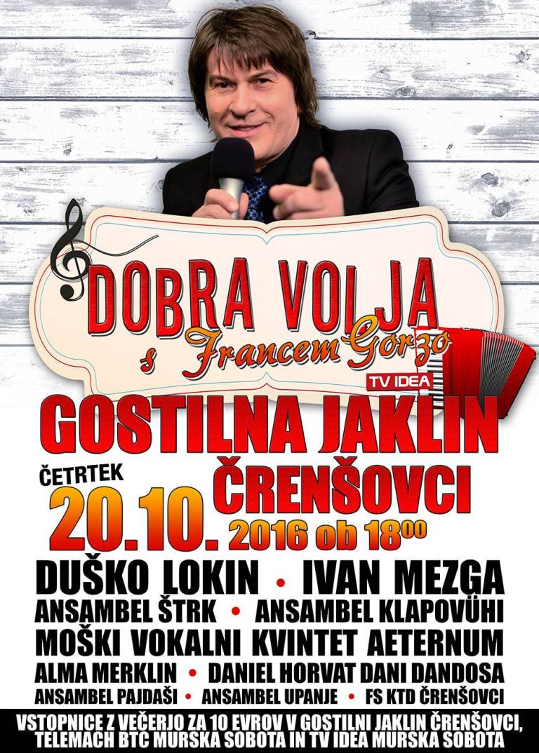 Naslednje snemanje Dobre volje s Francem Gorzo na TV IDEA bo v četrtek, 20. oktobra 2016, ob 18. uri v dvorani Gostilne Jaklin v Črenšovcih. Nastopili bodo Duško Lokin, Ivan Mezga, Aeternum, Alma Merklin, Dani Dandosa in ansambli Štrk, Klapovühi, Pajdaši in Upanje. Zaplesali pa bodo domači folkloristi iz KTD Črenšovci.