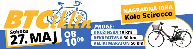 V soboto, 27. maja, ob 10. uri, je na sporedu 15. kolesarski maraton BTCiklin, ki je primeren za vse starosti in stopnje pripravljenosti. Kolesarji boste lahko izbirali med progami: družinska proga (deset kilometrov), rekreativna (30 kilometrov), veliki maraton (50 kilometrov) ter MTB proga dolga 20 kilometrov.