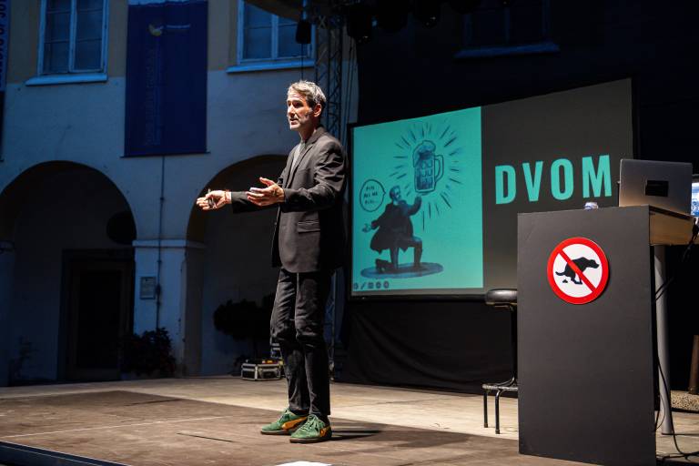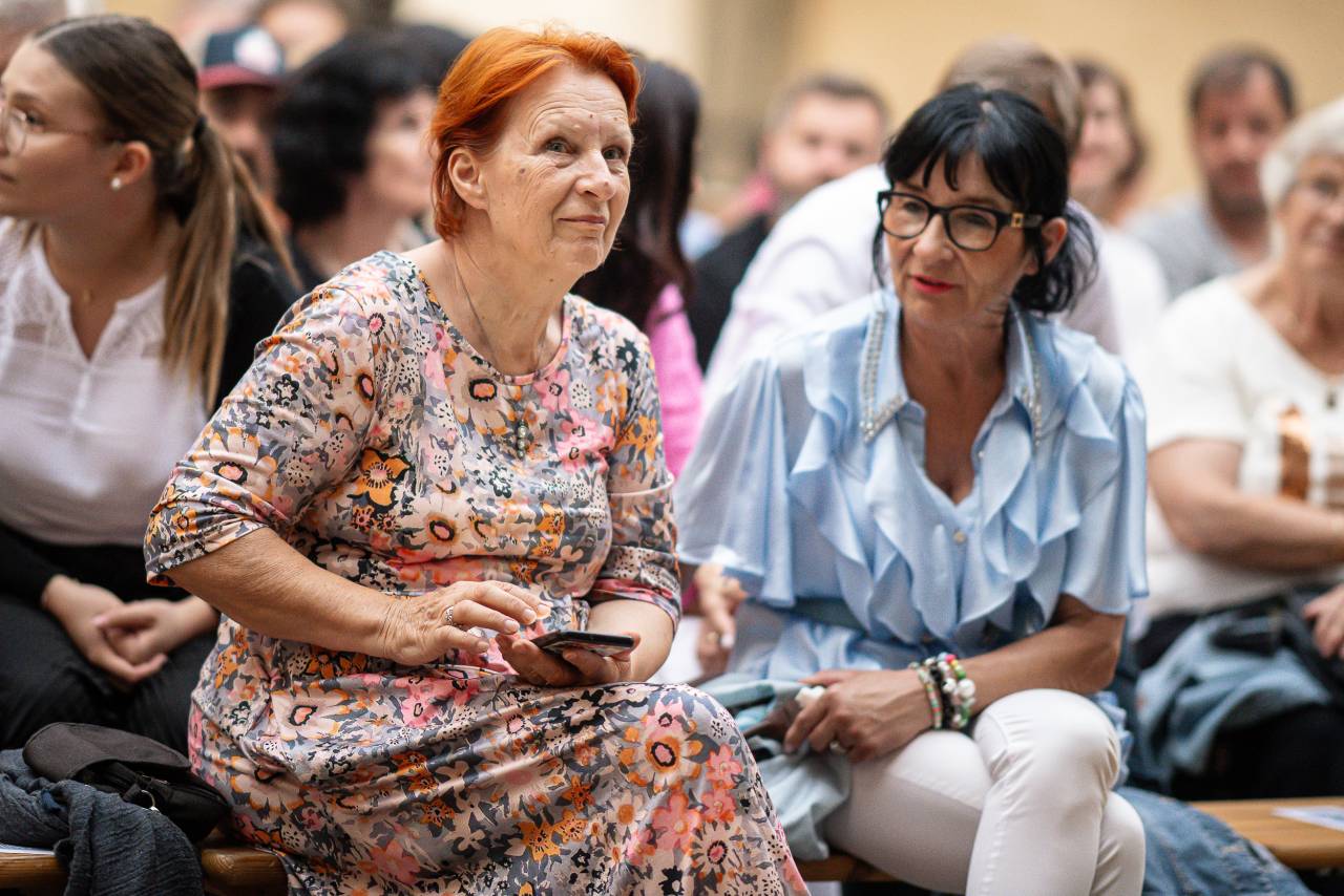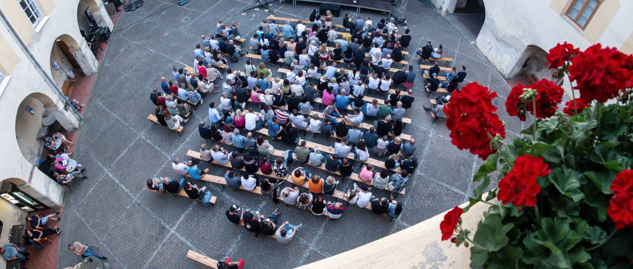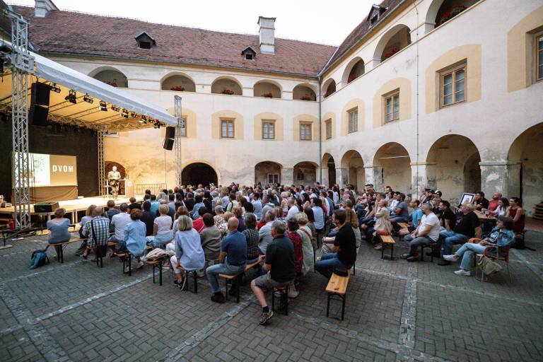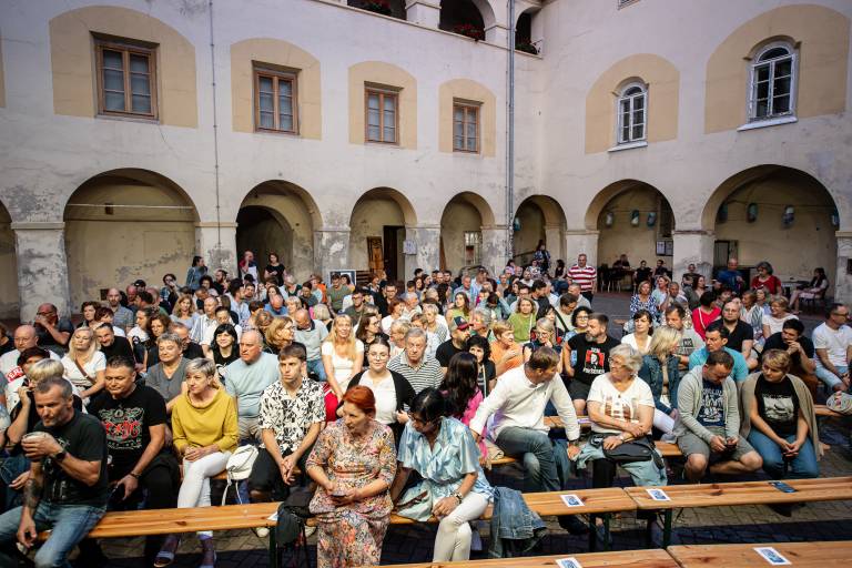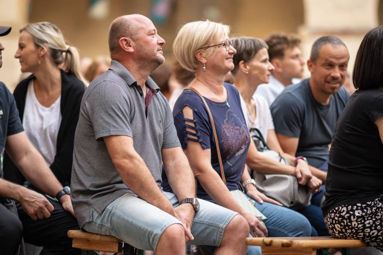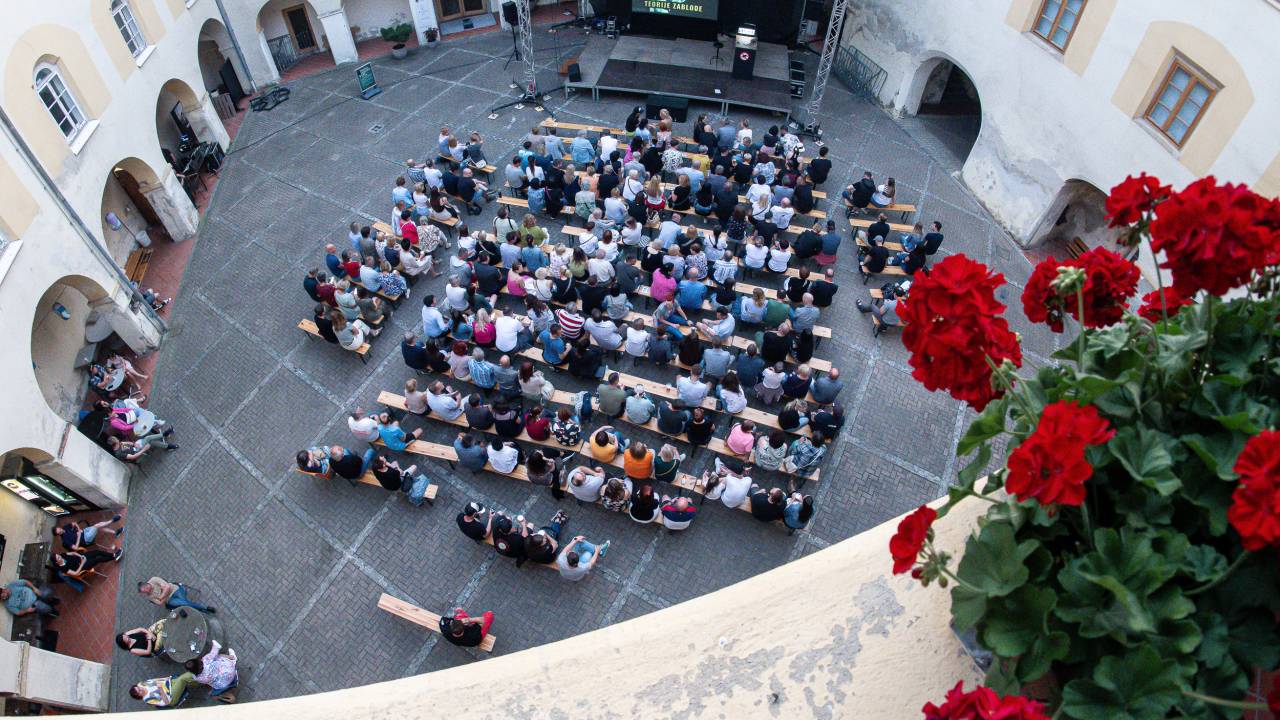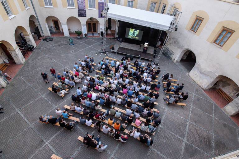 Miha Šalehar je z monokomedijo na grajskem dvorišču poskrbel za smeh vseh navzočih.