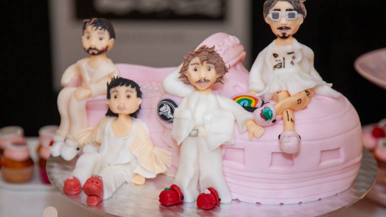 »Pa saj ne moremo verjeti, torta je cela umetnina! Naše male figurice pa so kot naši izrezani dvojniki. Počaščeni smo iz srca,« so povedali navdušeni glasbeniki, ki letošnjo pomlad prisegajo na barve v vseh pogledih, kar so dokazali tudi s svojimi opravami na modnem druženju.