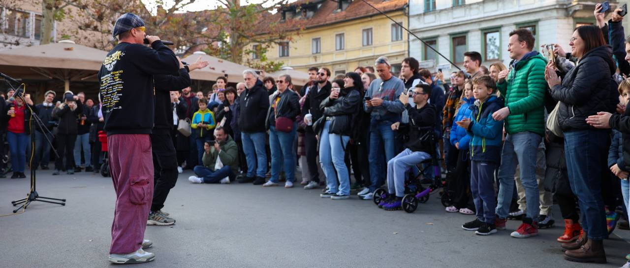 Dubioza Kolektiv je malo pred 15. uro pri Tromostovju presenetila z nepričakovanim »pop up« nastopom. Kratek šov je pritegnil lepo množico mimoidočih, ki so dogodek posneli s telefoni in navdušeno spremljali energičen nastop skupine.