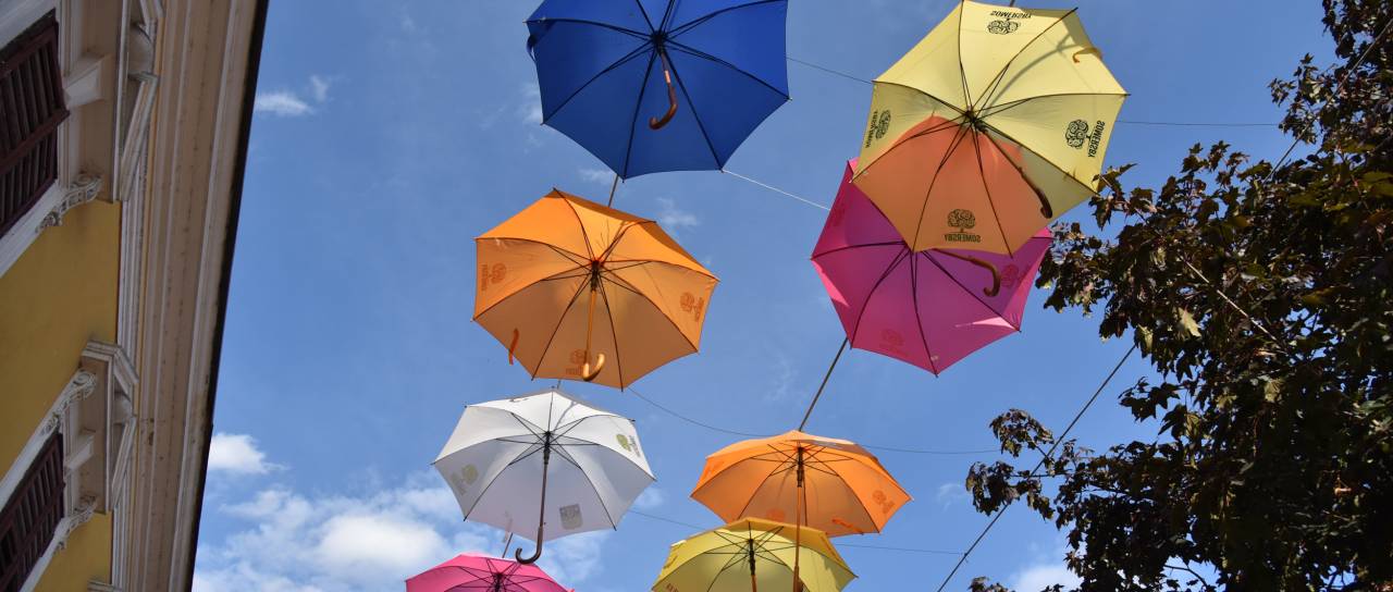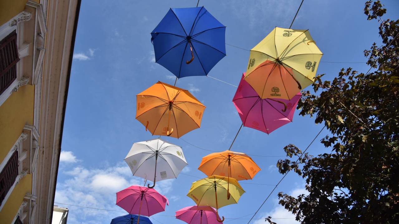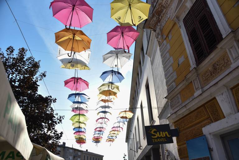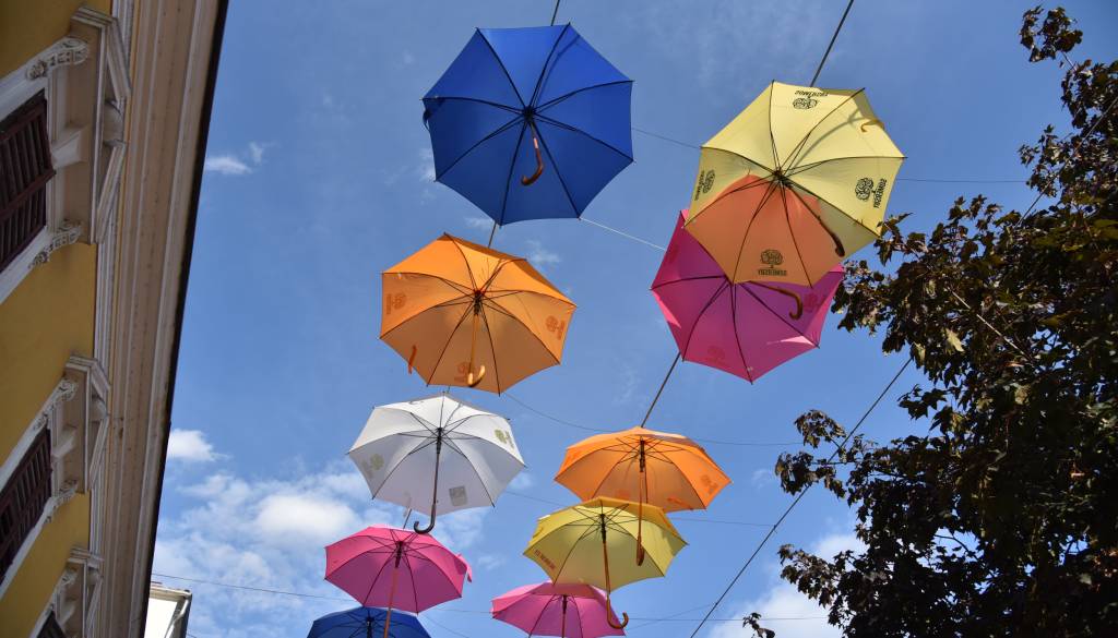 Poseben čar glavnim ulicam dajejo viseči dežniki, ki krasijo mestni prostor.
