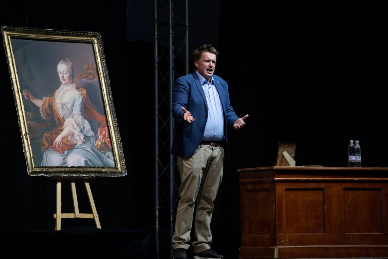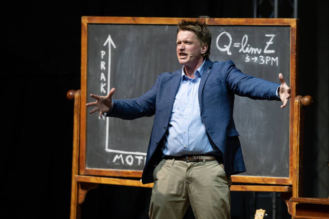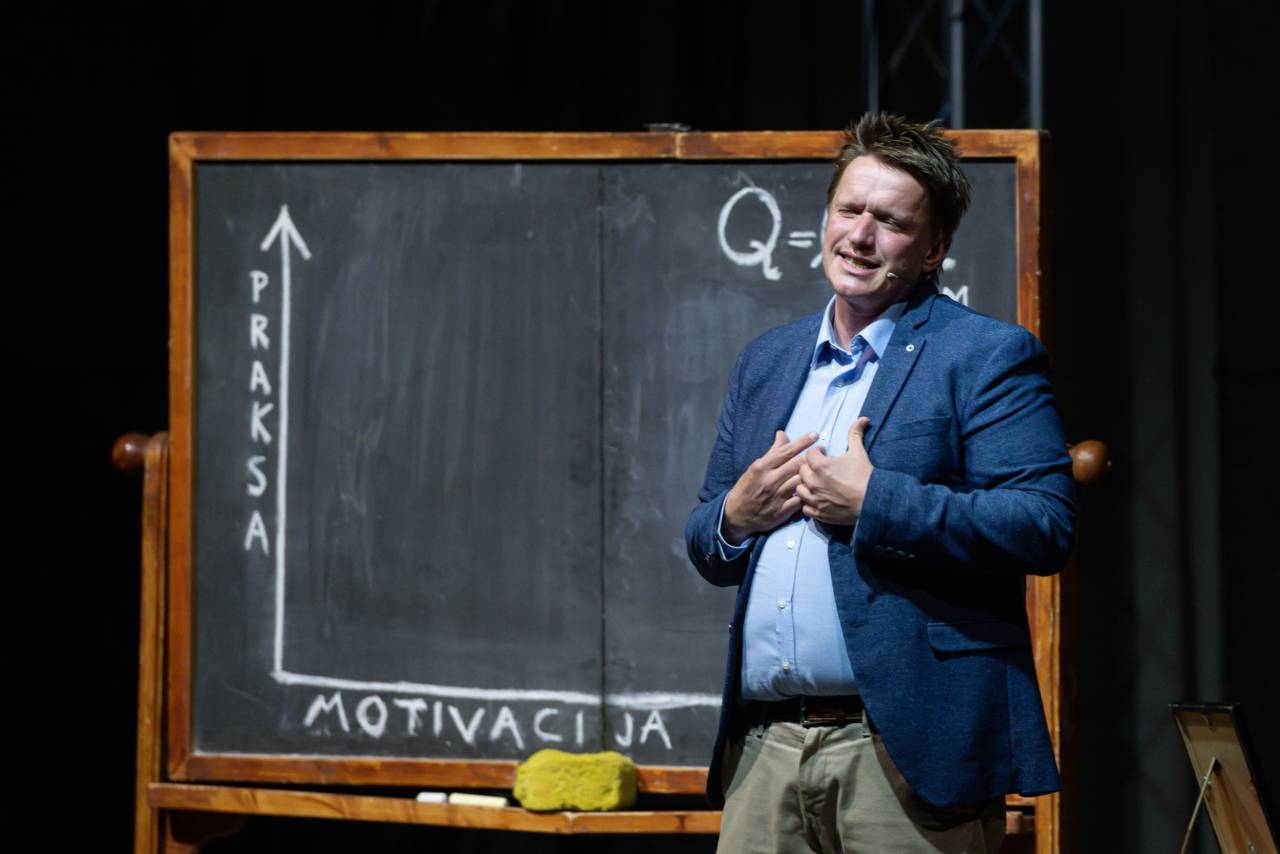 Uroš Kuzman je gledalce v monokomediji Profesor Kuzman mlajši popeljal na ekskurzijo po spominih na »piflanje, plonkanje in špricanje«.