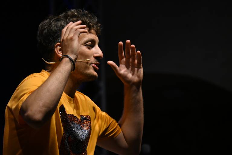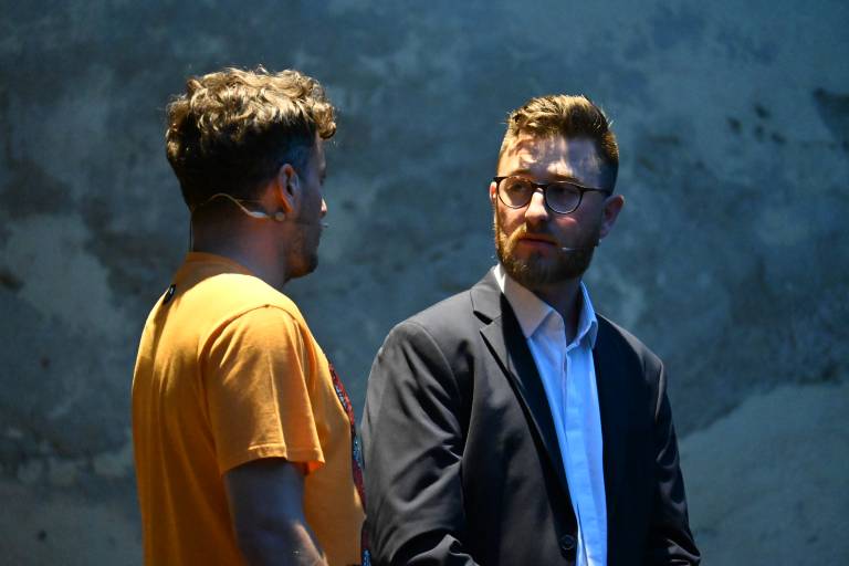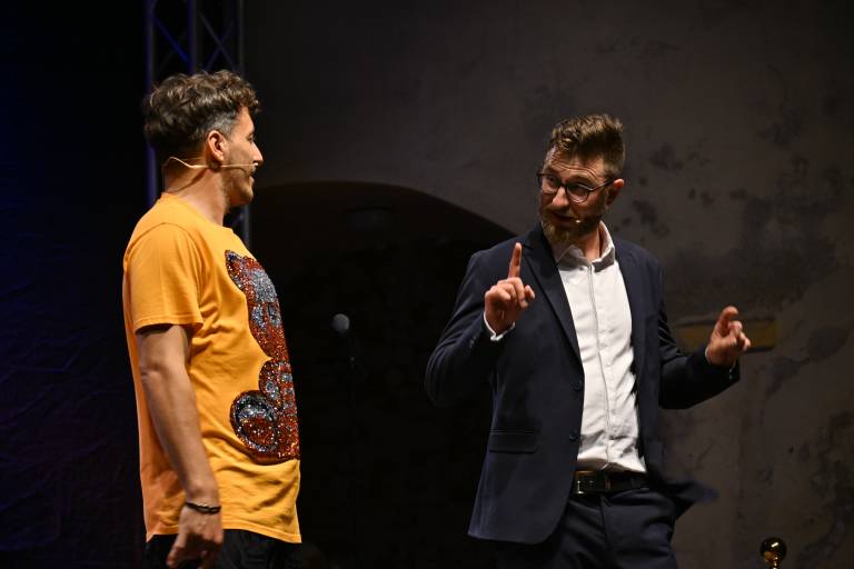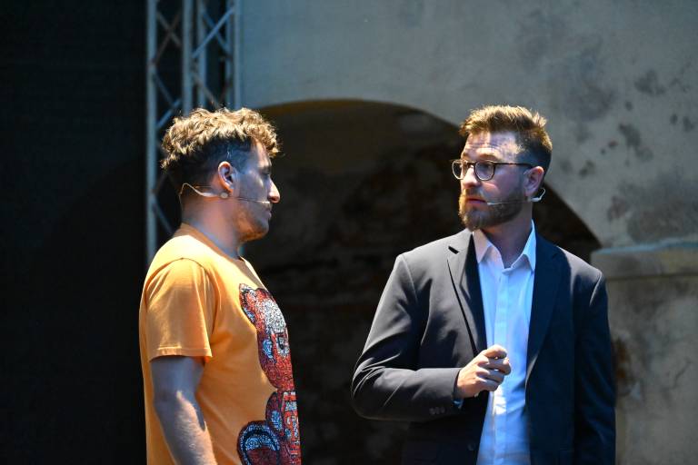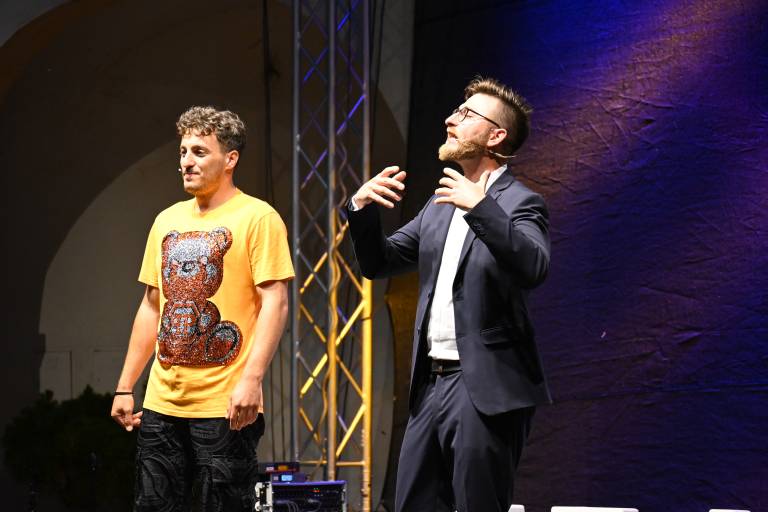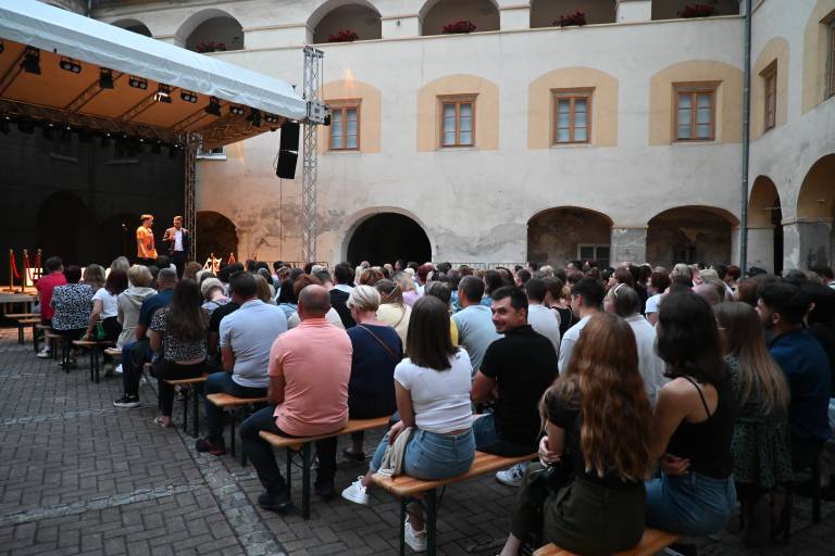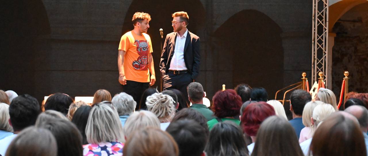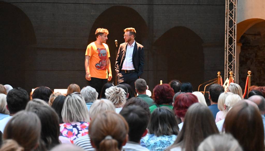 Na grajskem dvorišču sta za smeh poskrbela Žan Papič in Gašper Bergant.