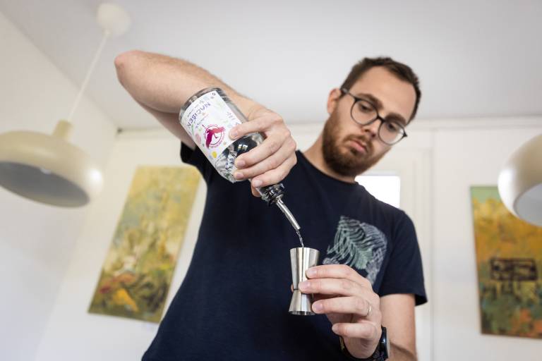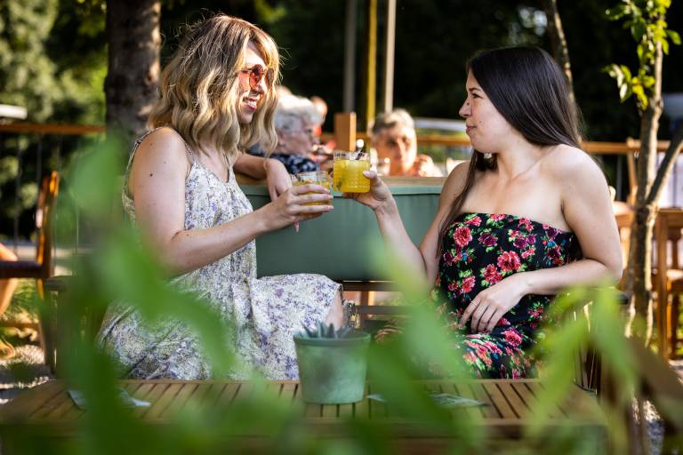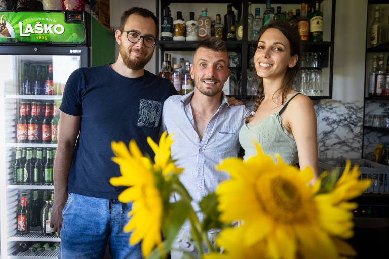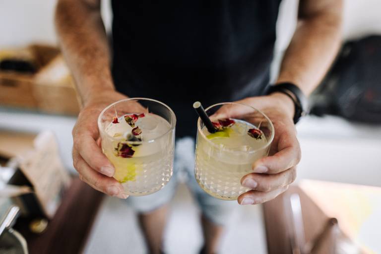 Na idilični terasi sredi goriške narave so popoldne preživeli ob koktejlih in prekmurskem ginu, ki ga je pripravljal mojster Jernej iz destilarne Beyond Mura.