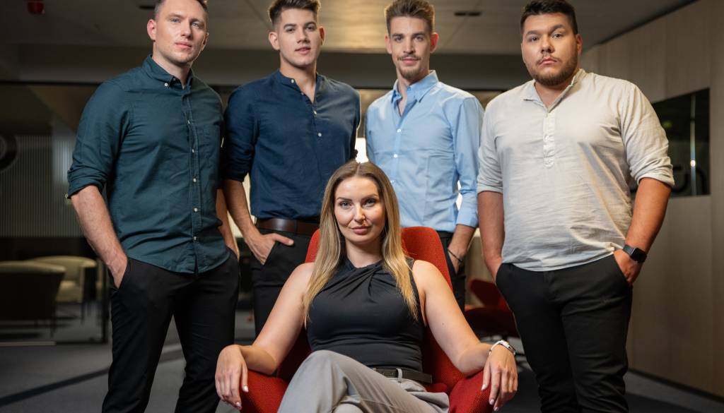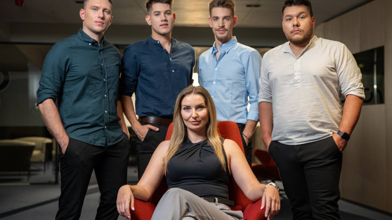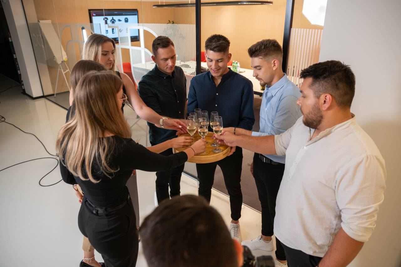 Skupaj s kolegi nazdravijo na uspešnost podjetja in nove izdelke, kar simbolizira nov začetek in skupno prihodnost.
