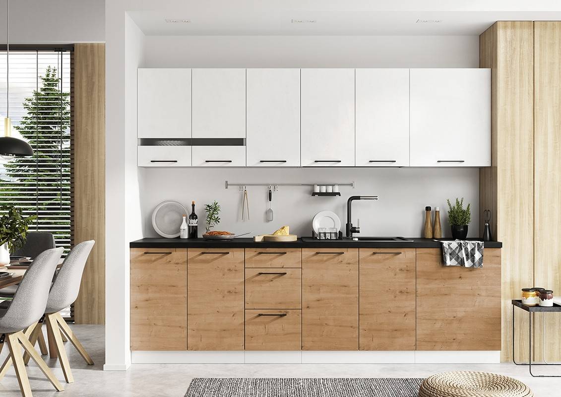 edstavo o njihovem končnem izgledu ne potrebujete posebnih skic in izrisov. Na ta račun pa prihranite bistveno več časa. Tudi poglobljeno merjenje in določanje dimenzij pri njihovem nakupu ni potrebno - izmerite le dolžino stene, kjer bodo stali delovni pulti in globino prostora, ki vam pove, kako velike viseče elemente lahko izberete za vaš nov kulinarični kotiček.