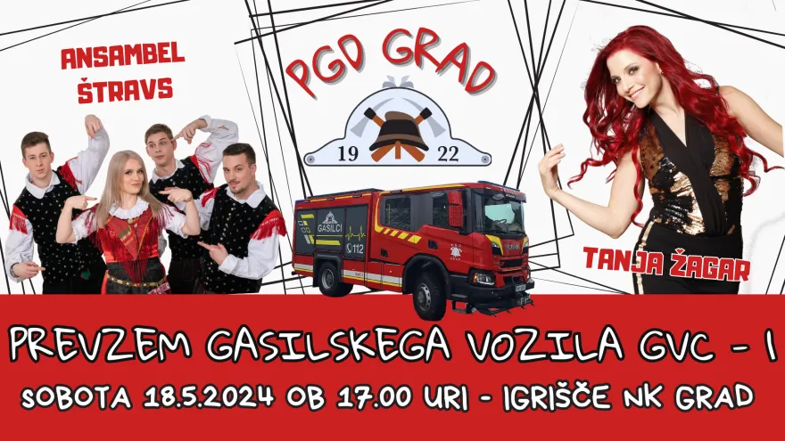 - Svečani prevzem novega gasilskega vozila GVC-1 in veselica z Ansamblom Štravs in Tanjo Žagar na igrišču NK Grad ob 17. uri.