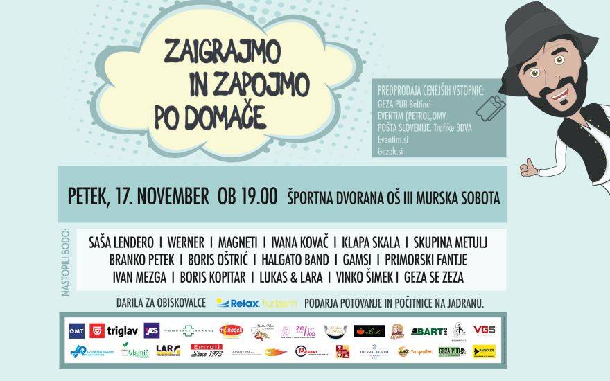 Ob 19. uri se vrača legendarna prireditev Zaigrajmo in zapojmo po domače. V športni dvorani Osnovne šole III Murska Sobota bodo nastopili številni znani glasbeniki, med drugim Saša Lendero in Werner.