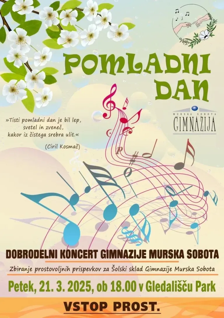 V Gledališču Park Murska Sobota bo ob 19. uri tradicionalni dobrodelni koncert Pomladni dan GMS, na katerem bodo nastopili sedanji dijaki Gimnazije Murska Sobota in posebni gostje.
