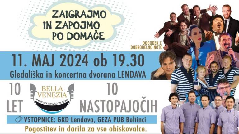 V Gledališki in koncertni dvorani Lendava se ob 19.30 začne glasbeni šov Zaigrajmo in zapojmo po domače ob 10. obletnici restavracije Bella Venezia.