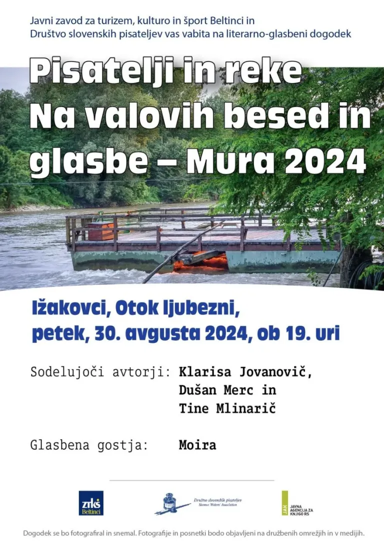 Literarno-glasbeni dogodek Pisatelji in reke Na valovih besed in glasbe – Mura 2024 na otoku Ljubezni v Ižakovcih ob 19. uri.