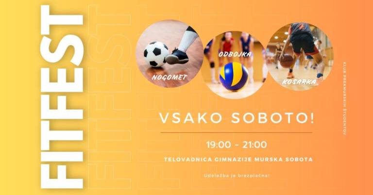 Na Osnovni šoli I Murska Sobota bo ob 19. uri odbojkarska tekma Panvita Pomgrad vs. Alpacem Kanal. Na Gimnaziji Murska Sobota pa se ob 19. uri lahko udeležite FitFesta.