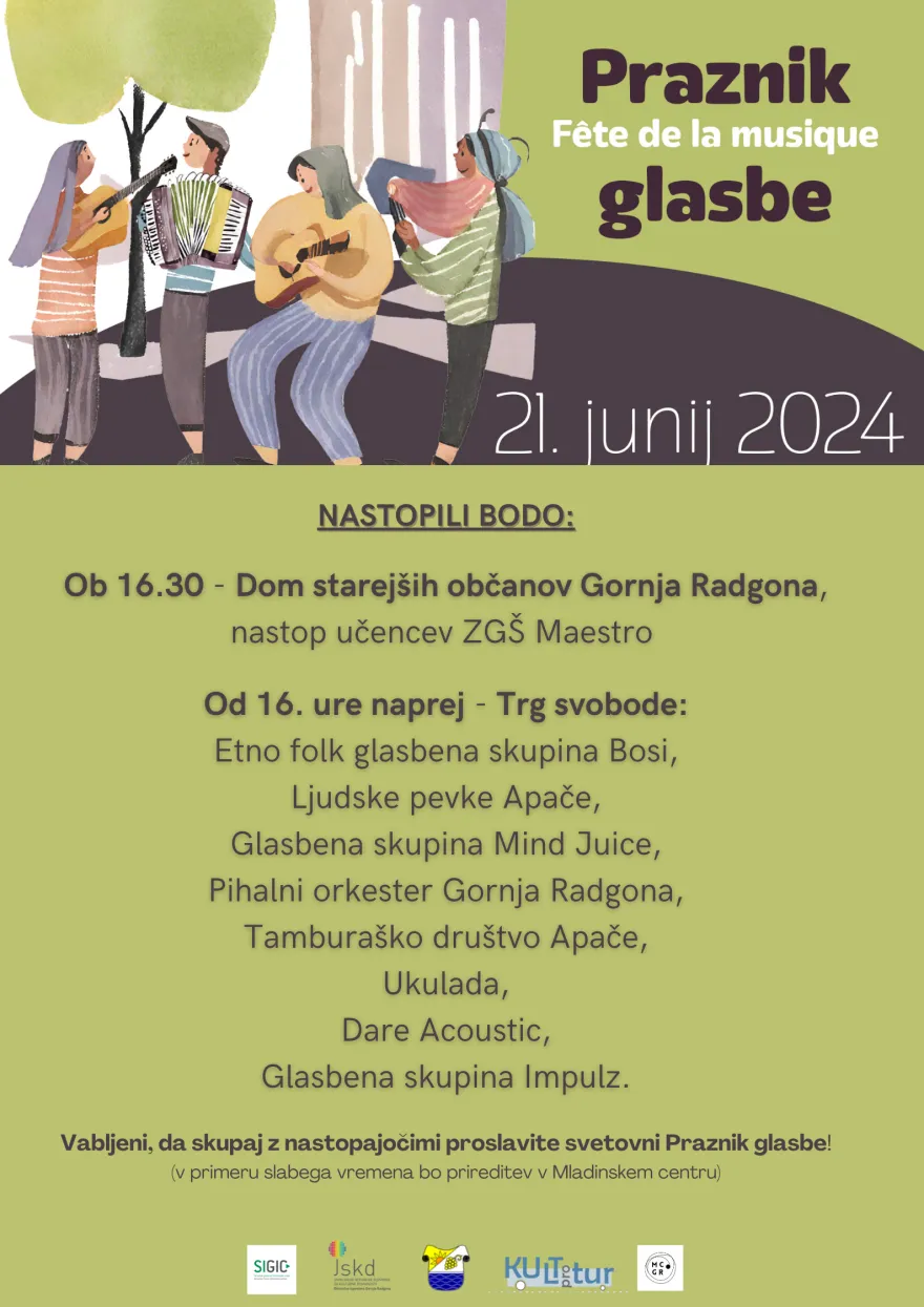 V petek, 21. junija, se v Gornji Radgoni začne Praznik glasbe. Ob 16.30 bodo v Domu starejših občanov Gornja Radgona, nastopili učenci ZGŠ Maestro, od 16. ure naprej pa se bodo na Trgu svobode zvrstili nastopi folklornih skupin.