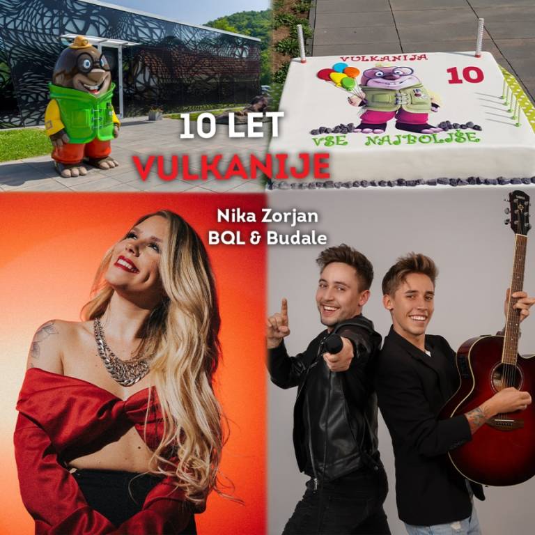 Tudi Doživljajski park Vulkanija praznuje, in sicer deseto obletnico. Skozi cel dan bodo potekale aktivnosti za celo družino, ob 15. uri pa bo nastopila Nika Zorjan. Ob 18. uri sledi še koncert skupine BQL.