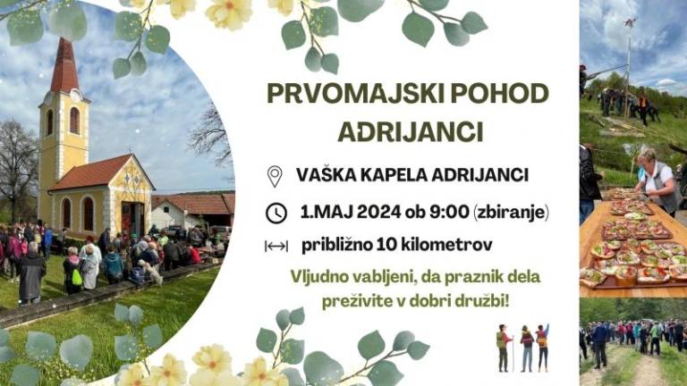Že 16. prvomajski pohod pa bo tudi v Adrijancih. Pohod se bo začel ob 9. uri pri vaški kapelici v Adrijancih, dolžina pohoda je deset kilometrov.