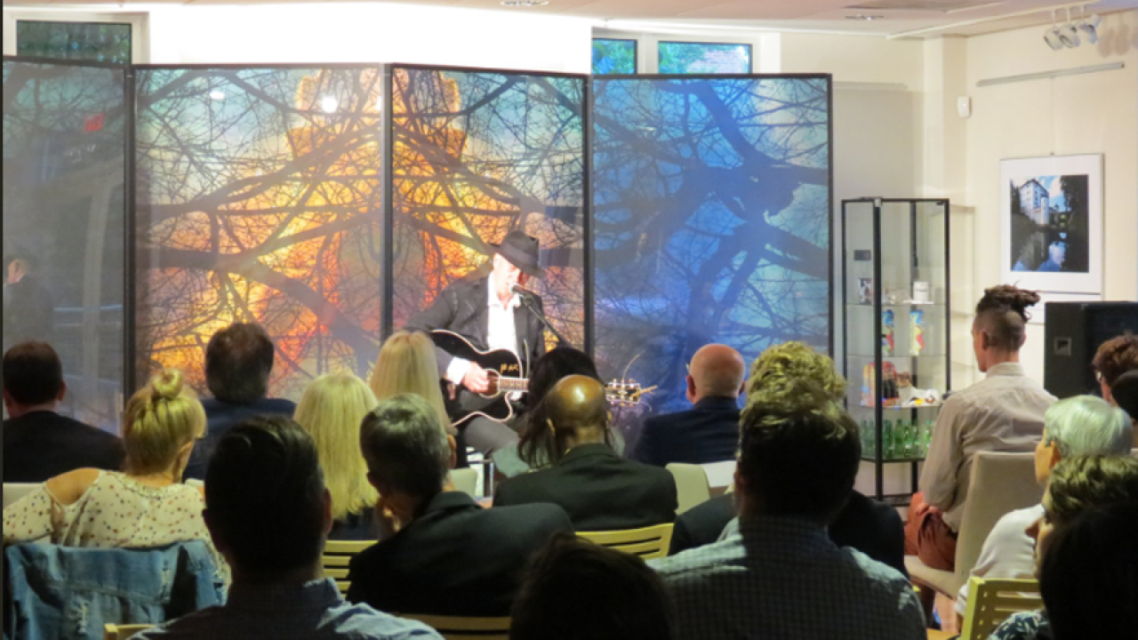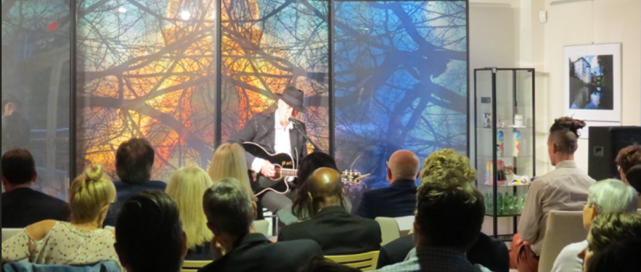 Prekmurska glasbena legenda Vlado Kreslin je v okviru literarno-glasbenega včeraj nastopil na slovenskem veleposlaništvu v Washingtonu.