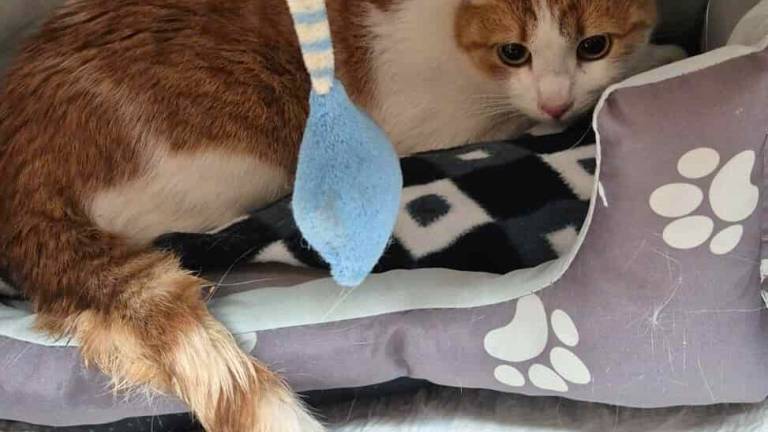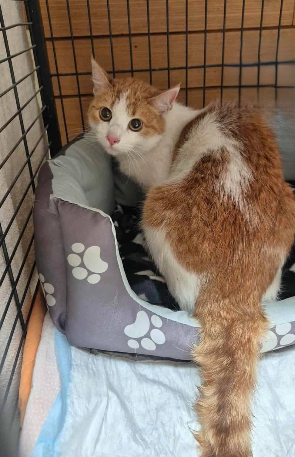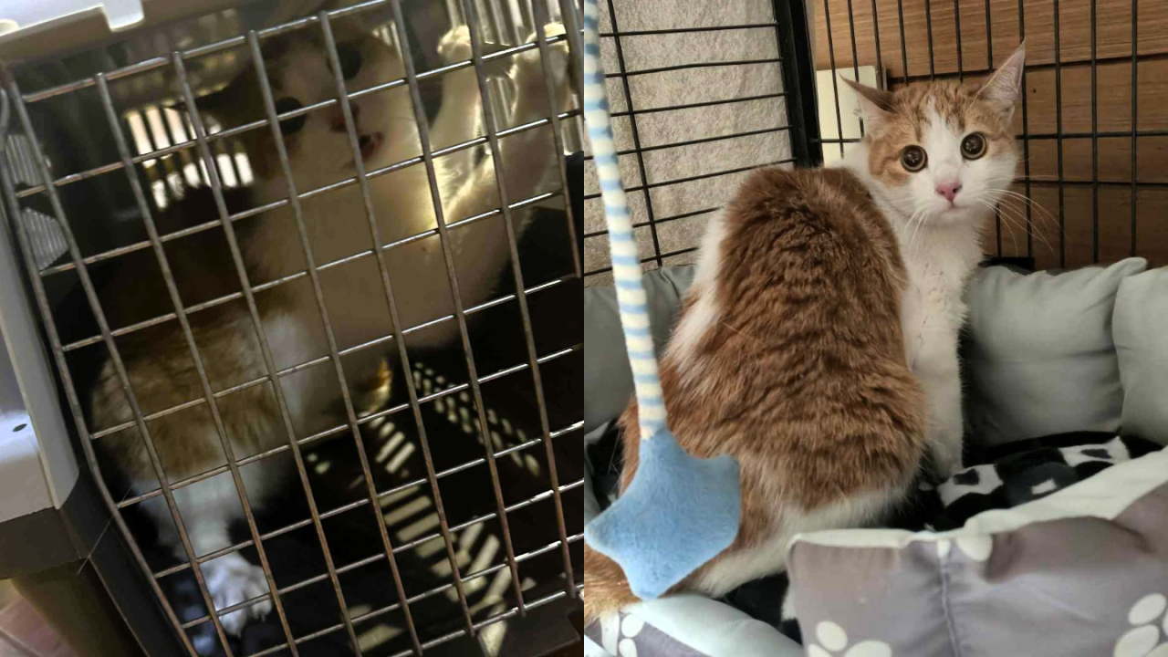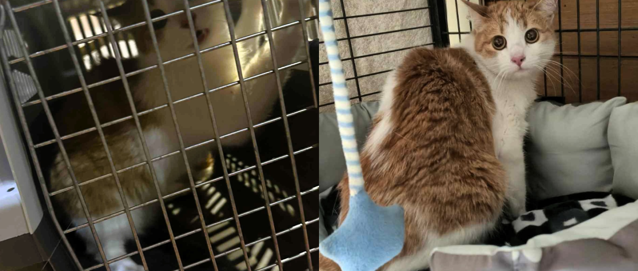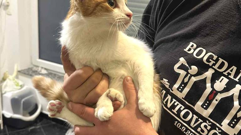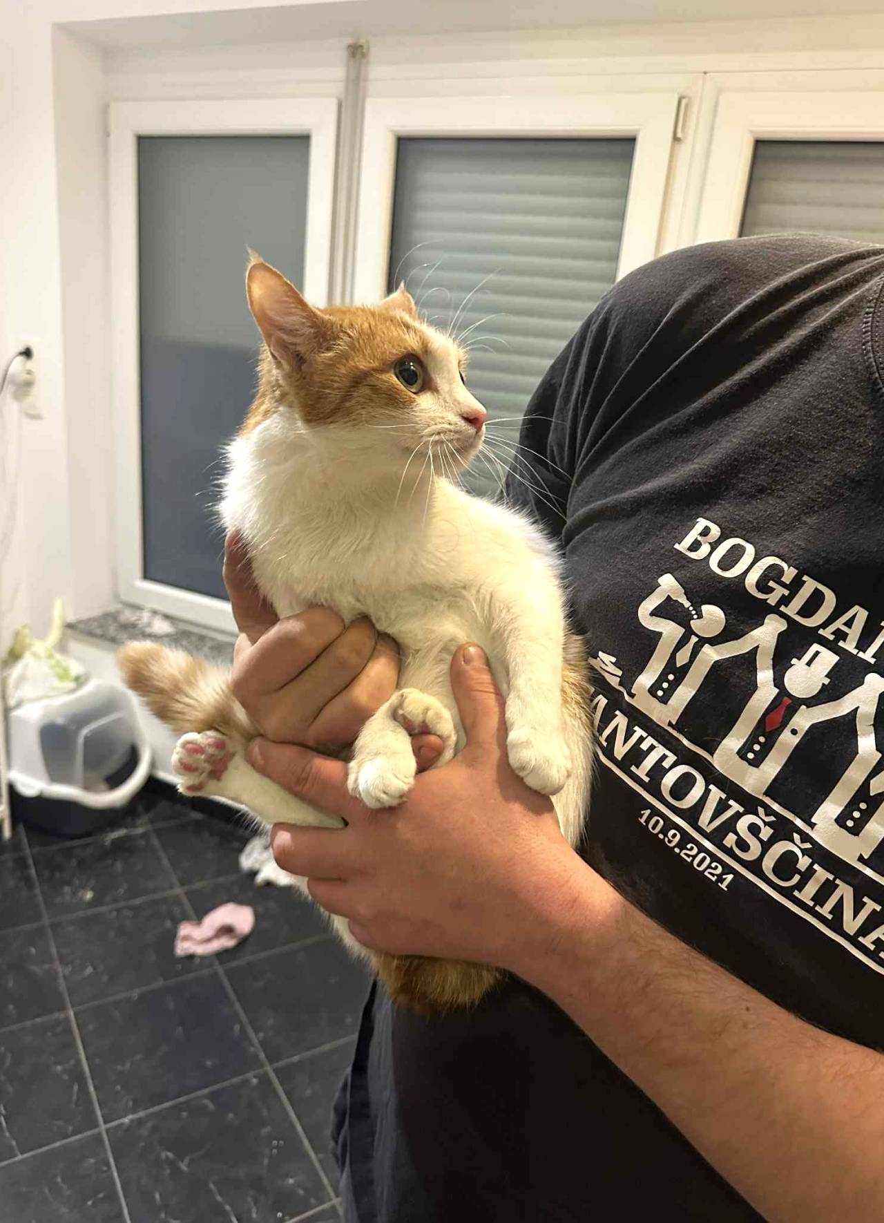 Maček je zdaj na varnem – začasno so ga sprejeli v društvu, kjer je po dolgih dneh samote končno dobil hrano, toplino in človeško bližino.