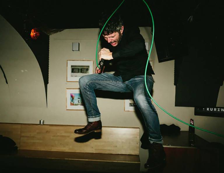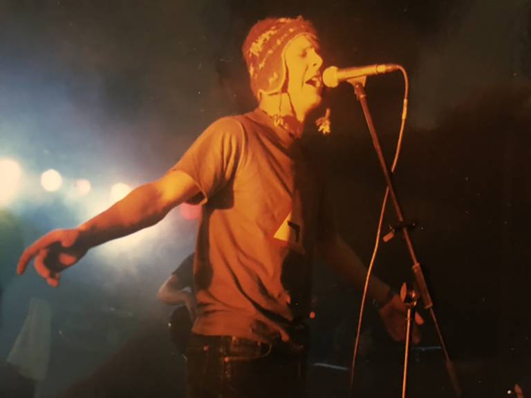 Očitno sem rad skakal. Na odru, dol iz odra, predvsem takrat, ko še sam nisem bil pripravljen, kaj šele fotografi. No tole je ujel naš fotograf Jani Ugrin v Lokal Patriotu nekje na Kings Of The Hill tour. Manjši je bil klubi, bolj gverilsko nas je odpeljalo.