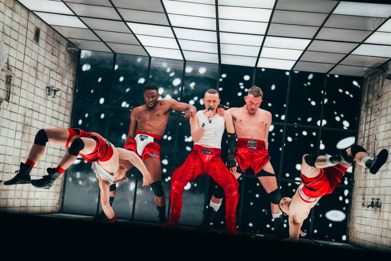 Izmed velike peterice je najprej na oder stopil britanski pevec Olly Alexander s pesmijo Dizzy. Skupaj s plesalci, oblečenimi v minimalno boksarsko opremo, je zapel v veliki »škatli«, ki spominja na umazano moško garderobo na krovu vesoljske ladje.