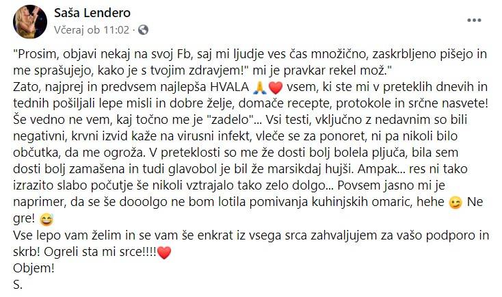 Na prošnjo svojega moža je Saša Lendero na Facebooku objavila zapis, s katerim je svoje oboževalce ponovno obvestila o svojem zdravstvenem stanju.