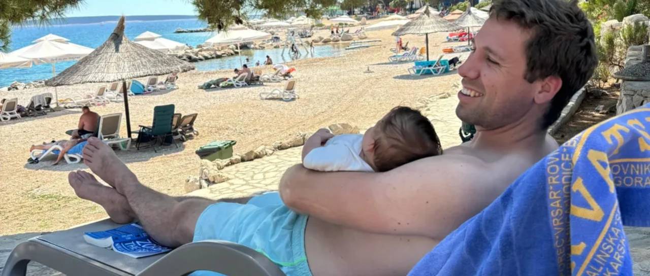 Glasbenik in vodja ansambla Saša Avsenika je z družino na dopustu, kjer mu družbo dela tudi novorojenček.