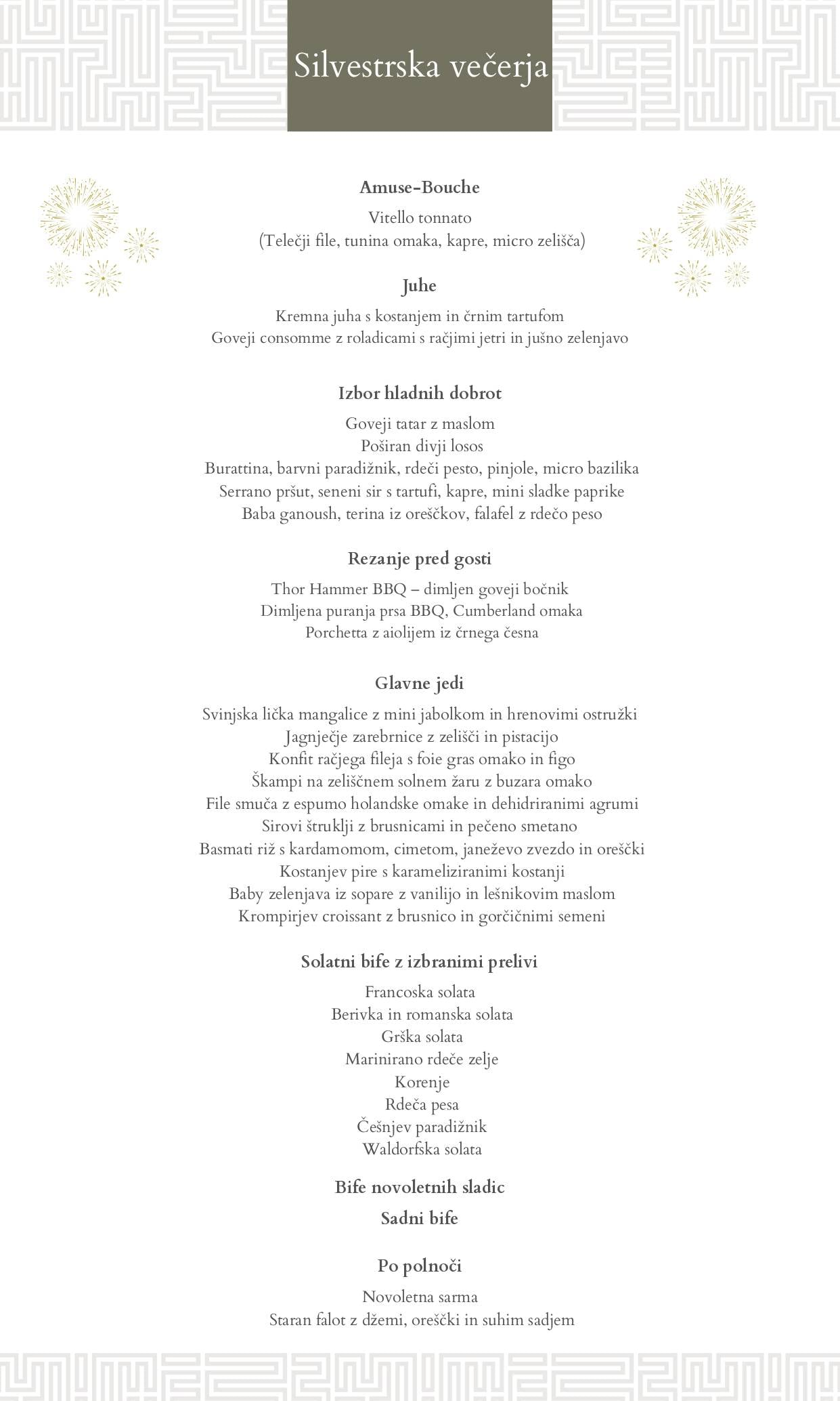 Na silvestrskem meniju bodo Thor hammer (dimljen celi goveji bočnik) z rezanjem pred gosti, konfit račjega fileja s foie gras omako in figo, svinjska lička mangalice v lastnem soku z mini jabolkom ter škampi na solnem žaru.