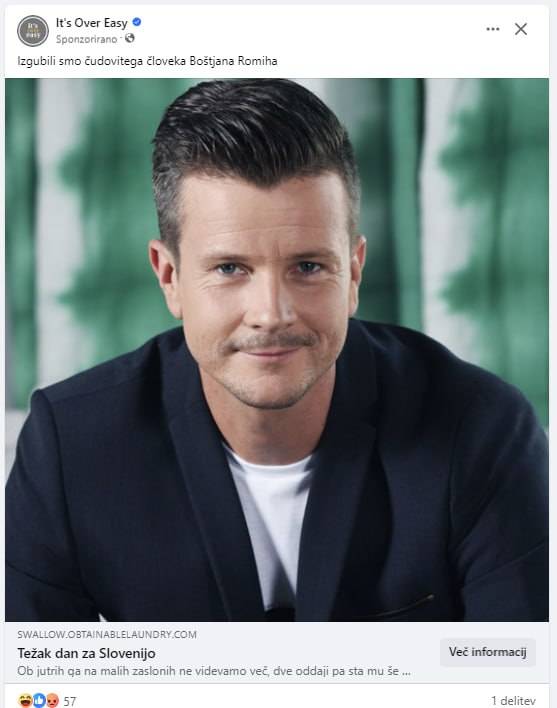 Spletnim prevarantom pa ni ušel niti Boštjan Romih. Na družbenem omrežju Facebook se je namreč pojavila objava z njegovo fotografijo, s pripisom »izgubili smo čudovitega človeka Boštjana Romiha«.