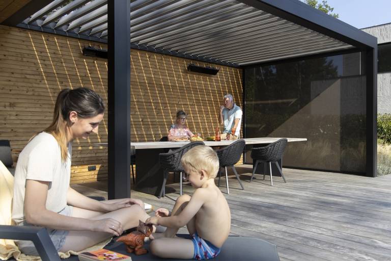 Bioklimatska pergola vam omogoča, da svoj zunanji bivalni prostor uporabljate skozi vse leto, saj vas ščiti pred soncem poleti in dežjem ter snegom v prehodnih obdobjih. Z dodatnimi elementi, kot so: ZIP screen roloji, steko, LED osvetlitev, grelci ali senzorji, lahko hišico ob bazenu spremenite v pravo pametno hišico, ki ustreza vsem vašim potrebam.