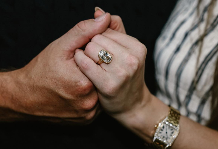 Diamant, vgrajen v prstan, je brušen v starem slogu, središče pa krasi briljant v obliki blazinice.