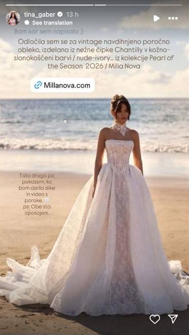 Na poroki Tine Gaber je bila osupljiva svetlo kremasta obleka, ki jo je nosila, znamke Milla Nova, kolekcija Pearl of the Season 2026, izdelana iz elegantne čipke Chantilly