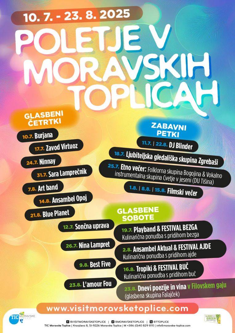 V naslednjih dneh se začenja Poletje v Moravskih Toplicah – čas, ko se vsak četrtek, petek in soboto zvečer, od 10. julija do 23. avgusta, središče kraja spremeni v živahno prizorišče glasbe, dobrih okusov in sproščenega druženja pod zvezdami.
