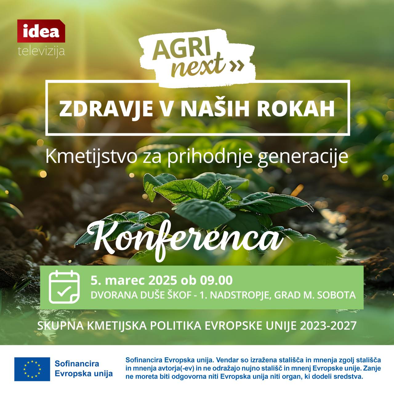 Po uspešni lanskoletni konferenci, ki je pritegnila več kot 60 udeležencev, televizija IDEA tudi letos vabi na konferenco Zdravje v naših rokah – Kmetijstvo za prihodnje generacije, ki bo v sredo, 5. marca 2025, ob 9. uri, v dvorani Duše Škof v murskosoboškem gradu.
