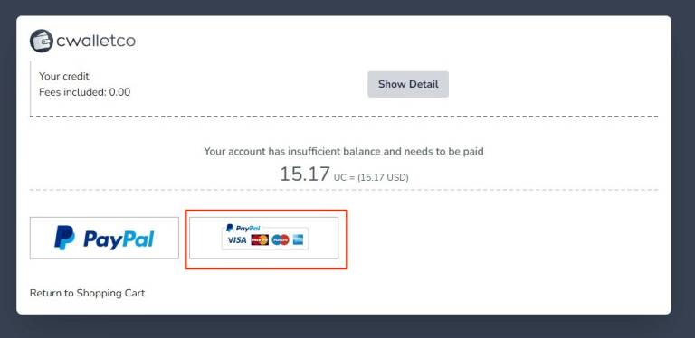 2. Ko izpolnite potrebne podatke, kliknite 'cwalletco', da izberete način plačila. Za PayPal se ni treba registrirati, svojo kreditno kartico lahko uporabite neposredno prek PayPala.