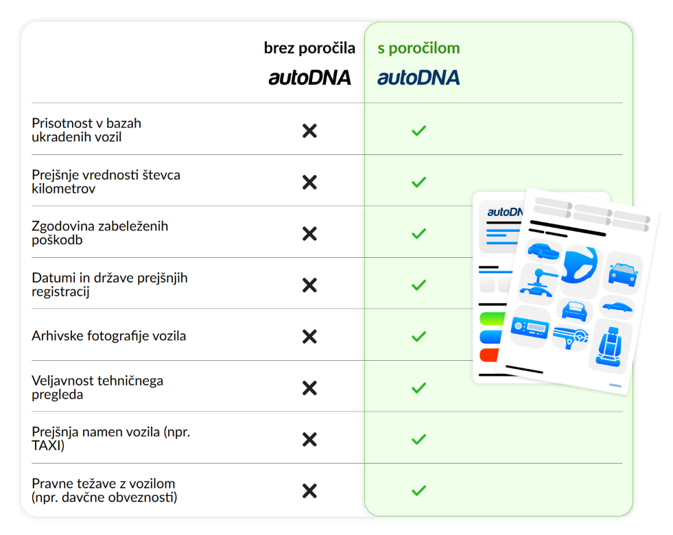 Paket poročil o zgodovini vozila autoDNA omogoča hitro in natančno preverjanje preteklosti avtomobila ter zagotavlja celovite podatke o škodah, servisnih vnosih in prejšnjih lastnikih. Kaj natančno vključuje poročilo in kako te informacije uporabiti pri prodaji rabljenih vozil? (vir: priloženi dokument)