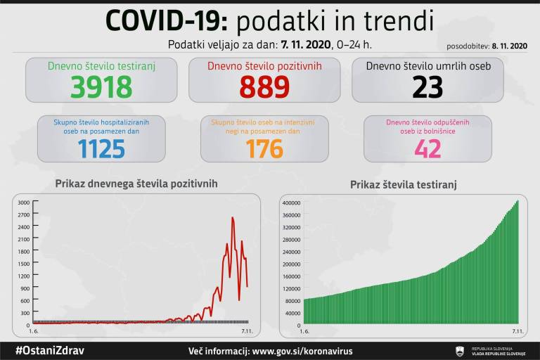 V Sloveniji so včeraj, 7. novembra, opravili 3918 testov na koronavirus. Kot je na družbenem omrežju Twitter že sporočil vladni govorec Jelko Kacin, so potrdili 889 novih okužb. Delež testov, ki so pokazali pozitiven rezultat, je znašal 22,69 odstotka.
