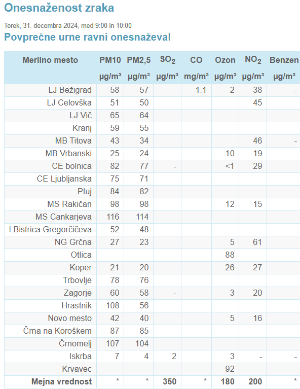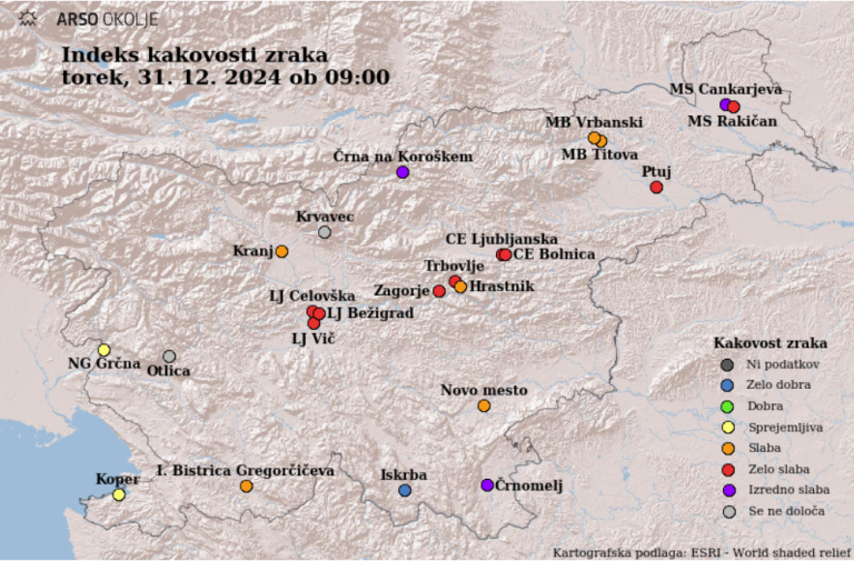 Poročilo o kakovosti zraka za danes, 31. decembra 2024, kaže na kritično stanje v več mestih po Sloveniji.