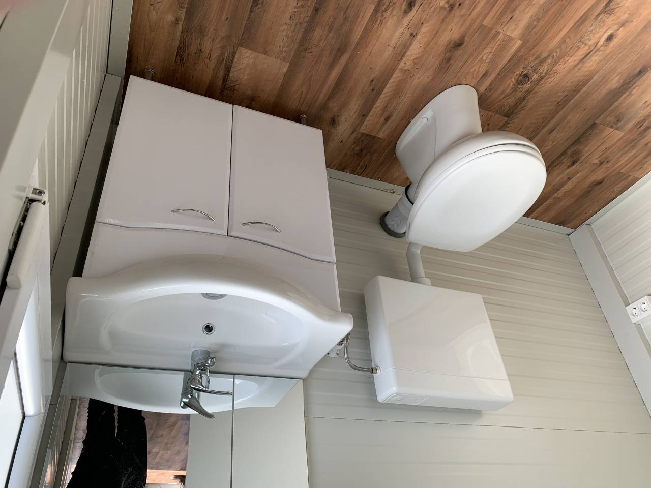 Opremljen je z vso potrebno elektro in vodno inštalacijo ter z električnim grelnikom