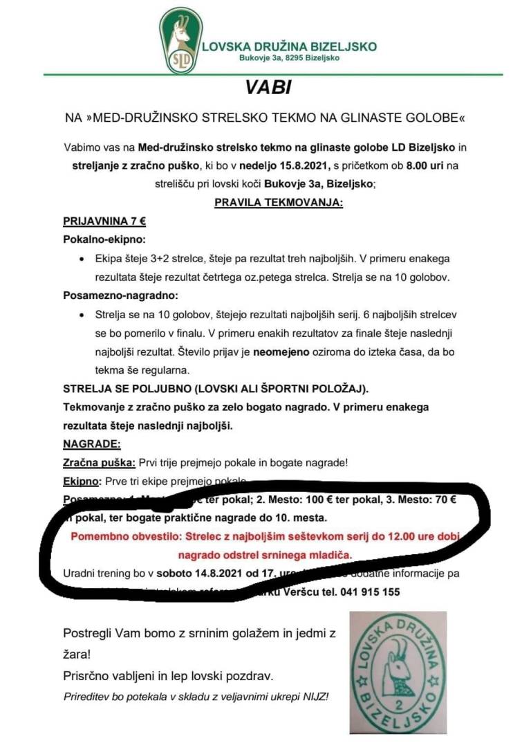 Na praznik Marijinega vnebovzetja Lovska družina Bizeljsko vabi na »Med-družinsko strelsko tekmo na glinaste golobe in streljanje z zračno puško.« To bo potekali od 8. ure naprej na strelišču pri lovski koči v Bukovju pri Bizeljskem.